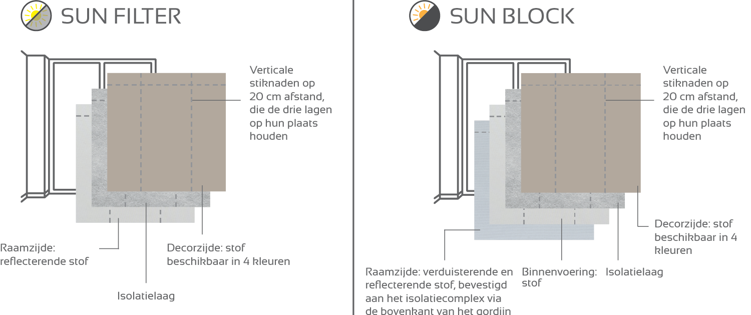 Onze thermische oplossing is M1-brandwerend geklasseerd. Om zich aan al uw ruimtes en lichtafschermingsbehoeften aan te passen, is ze verkrijgbaar in zonwerende of verduisterende uitvoering.